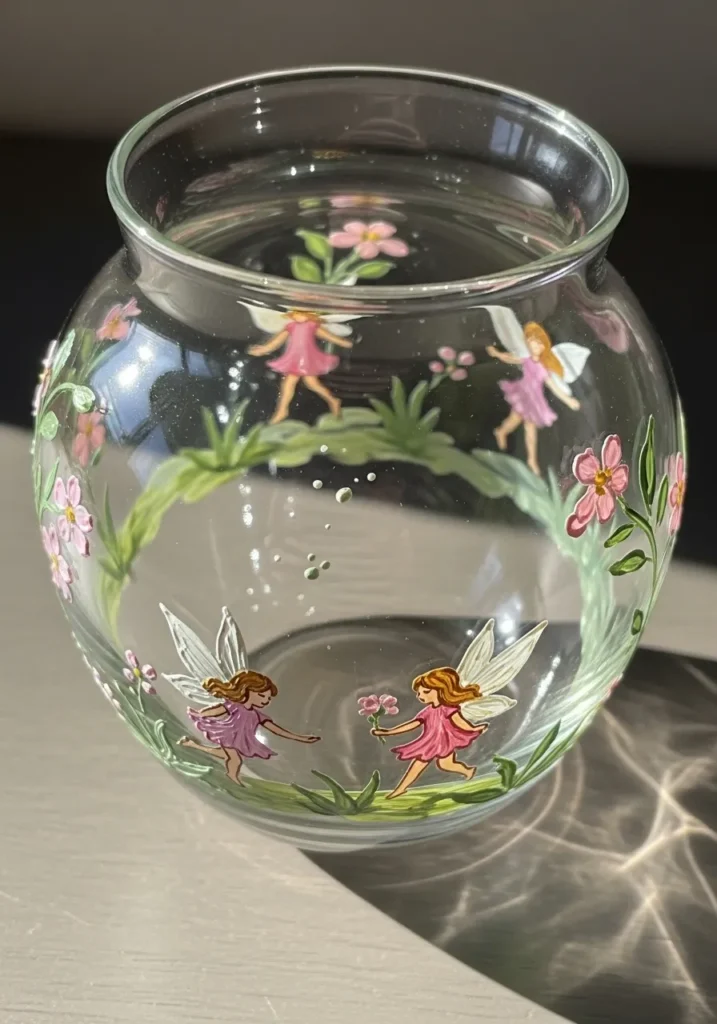 I think this craft is a total dream because it lets you build your very own tiny world inside a simple glass bowl. If you want a project that feels like a sweet escape, then painting these little magical friends is the perfect way to spend a rainy afternoon. It is surprisingly easy to create a sense of movement by simply spacing the fairies out and adding those little green tendrils to connect them. I love how this turns a basic fishbowl into a piece of decor that would look absolutely precious in a nursery or on a bookshelf filled with some sparkly fairy lights.