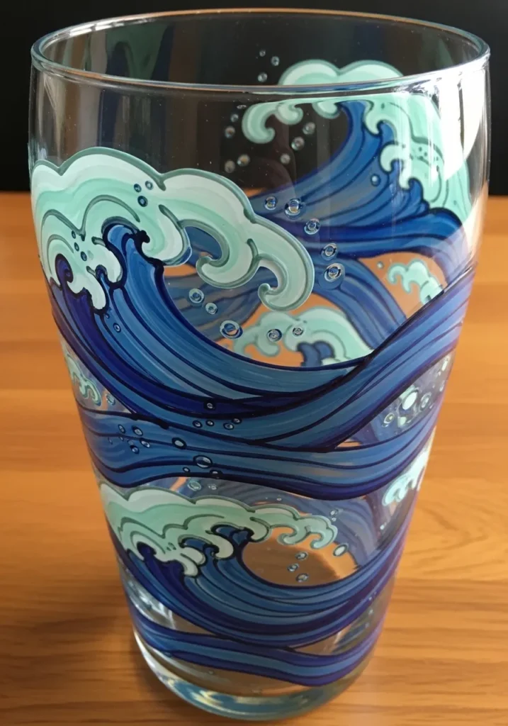 This stunning glass cylinder features a dynamic wrap-around design of powerful breaking waves in a rich aquatic palette. Deep indigo and royal blue layers form the base of the swells, while mint green and crisp white highlights create the look of churning sea foam and spray. The artist used fluid, sweeping strokes to give the water a sense of constant motion, accented by tiny white bubbles that appear to fizz across the clear glass surface. Thick, opaque paint gives the crests a wonderful physical presence that contrasts beautifully with the smooth, transparent areas of the vessel.