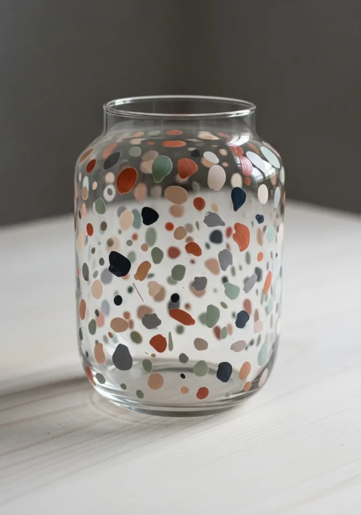This stylish glass vessel is transformed into a modern art piece with a beautiful array of hand-painted abstract speckles that mimic the look of high-end terrazzo. The design features a sophisticated palette of muted earth tones, including dusty terracotta, sage green, slate grey, and warm sandy beige, all scattered playfully across the clear surface. Each fleck shows off a thick, organic texture where the paint has been dapped on with a deliberate yet relaxed hand. The varied sizes and irregular shapes of the speckles create a wonderful sense of rhythm and movement that feels grounded and incredibly trendy.
