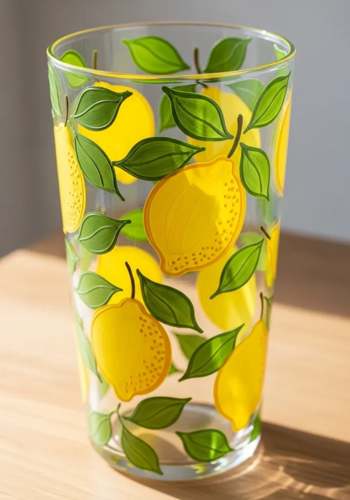 I think this project is a total blast because lemons just radiate happiness and energy. If you are looking for a quick way to brighten up a dark corner or a plain shelf, this is definitely the craft for you. It feels like such a win to take a standard tall vase and give it this much personality with just a few tubes of glass paint. I love how the transparent background keeps it looking light and airy while those pops of yellow really grab your attention.