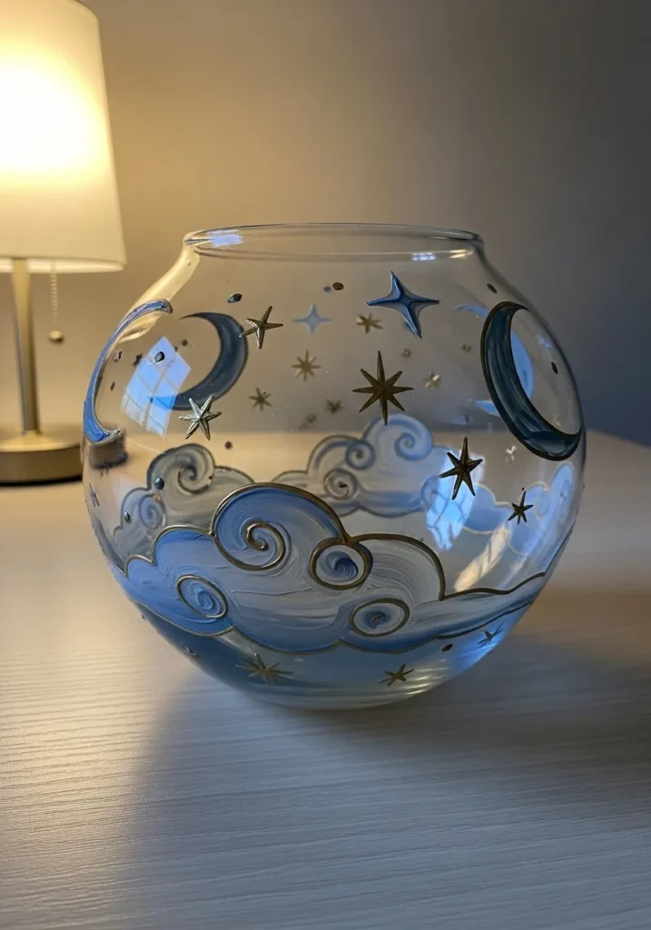 This rounded glass fishbowl vase serves as a stunning canvas for a magical nighttime scene. Swirling blue and white clouds with golden outlines anchor the bottom, while shimmering gold stars and crescent moons dance across the upper half. The artist used a mix of metallic gold paint and soft powdery blues to create a celestial landscape that looks like it was pulled straight from a fairy tale. I love the way the thick paint creates a raised effect on the glass, which adds a wonderful tactile quality to the celestial bodies and rolling clouds.