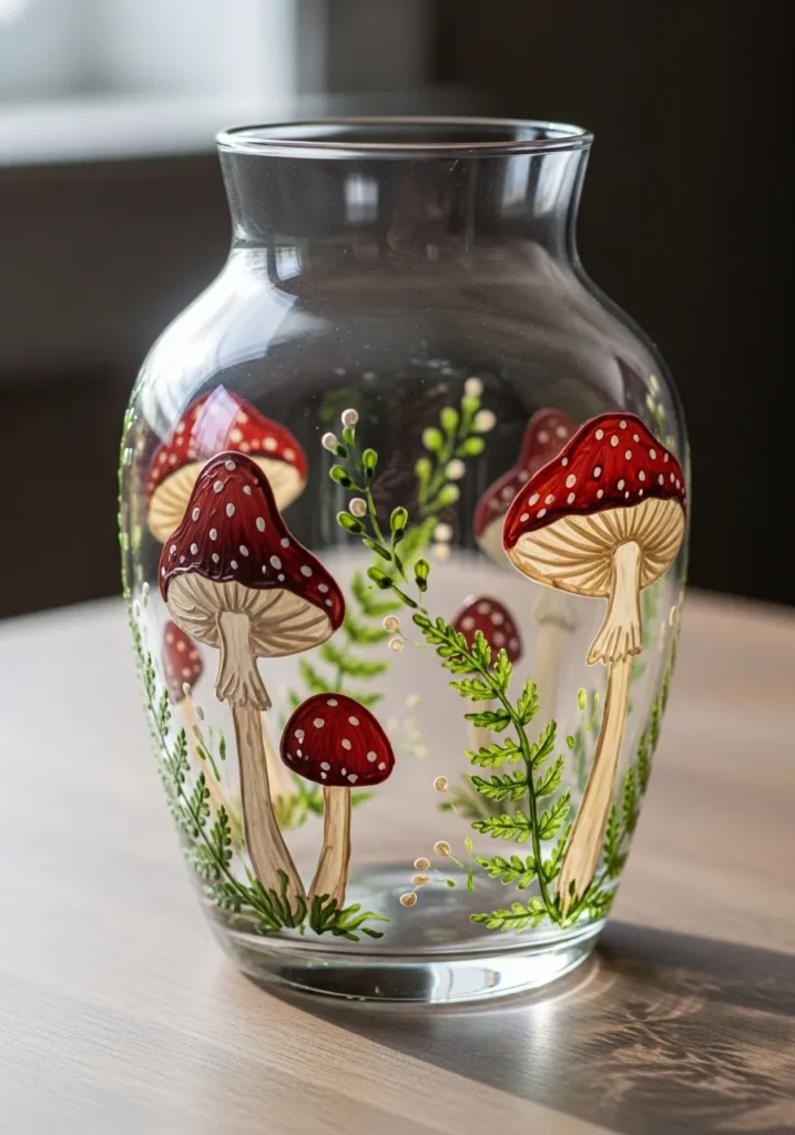 This glass vase captures a magical forest floor with its detailed hand-painted mushrooms and delicate ferns. The design features classic red-capped toadstools with crisp white spots and slender cream-colored stems that look incredibly realistic against the clear glass. Vibrant emerald green fronds and tiny sprigs of wild berries wrap around the base of the vessel to create a lush, layered effect. The use of glossy enamel paints gives the fungi a beautiful shine, while the fine brushwork on the gills underneath the mushroom caps adds a professional touch of depth and texture.