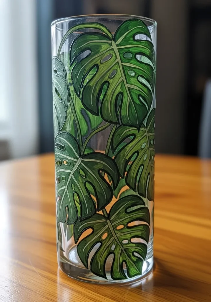 This sleek cylinder glass vase undergoes a tropical transformation with a bold wrap-around design of oversized monstera leaves. The artist used various shades of deep forest green and bright lime to create the iconic split leaf patterns that cover nearly the entire surface of the glass. Black outlines provide a sharp graphic quality, while the visible brushstrokes within the leaves add a wonderful organic texture and depth. Because the leaves are layered at different heights and angles, the whole piece feels like a slice of a thriving indoor jungle captured on a clear modern vessel.