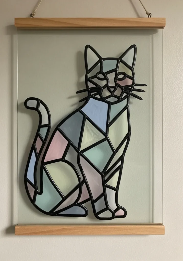 This elegant wall piece showcases a sitting cat silhouette filled with a modern geometric mosaic pattern. The design features a soft palette of muted pink, mint green, sky blue, and creamy yellow acrylics that contrast beautifully with the heavy black leading. Framed by simple light wood supports at the top and bottom, the clear glass background makes the cat appear as if it is floating against the wall. The clean lines and matte paint finish give it a sophisticated look that fits perfectly with a minimalist or contemporary home aesthetic.