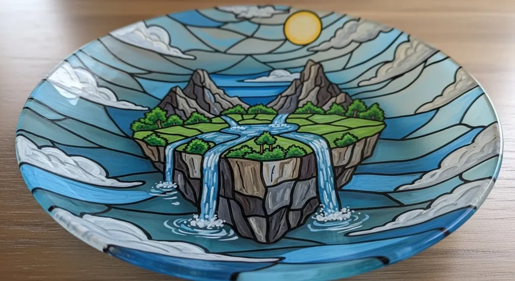 It is a fantastic idea to use a clear glass plate as your canvas for a landscape this detailed. This project allows you to practice layering different shades of blue to create the illusion of flowing water without needing expensive professional equipment. You can easily turn a thrift store find into a stunning conversation piece that brings a bit of fantasy and serenity to your home office or entryway.
