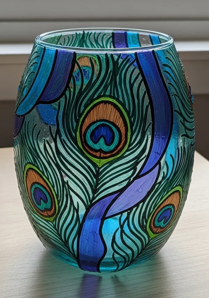 This stunning vase is a celebration of jewel tones and intricate patterns. The design features large peacock feathers painted with rich emerald green, sapphire blue, and warm copper acrylics. Each feather is detailed with fine black lines to mimic the delicate texture of real plumage, while the background is tinted with a transparent teal wash. The flowing purple and blue ribbons weaving through the feathers add a sense of elegance and movement, making the entire piece look like a professional stained glass installation on a smaller scale.
