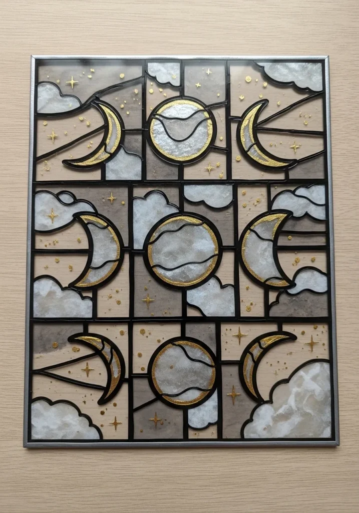 This sophisticated piece showcases the various stages of the moon set within a structured geometric grid. The color story is wonderfully muted, using soft taupe, smoky gray, and crisp white for the clouds, while the lunar crescents are highlighted with a rich metallic gold. Each pane is separated by thick black leading lines that create a professional window effect, and tiny gold flecks serve as delicate stars scattered across the sky.