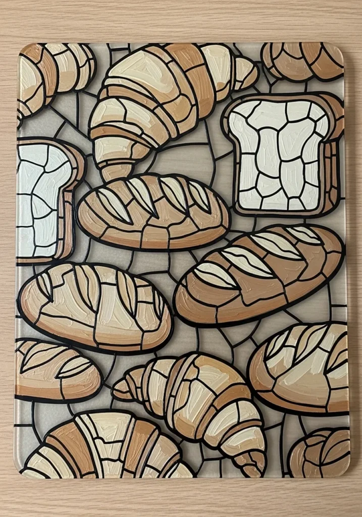 This delightful project turns a simple glass board into a carb lover’s dream with a mosaic of hand-painted bread and croissants. The design uses a cozy palette of warm beige, golden tan, and creamy white acrylics to create the different types of loaves and pastries. Each piece of bread is outlined with thick black leading, giving it a sturdy and defined look that contrasts perfectly with the frosted glass background. The textured brushstrokes within each section add a wonderful rustic feel that makes the whole collection of baked goods look incredibly inviting.