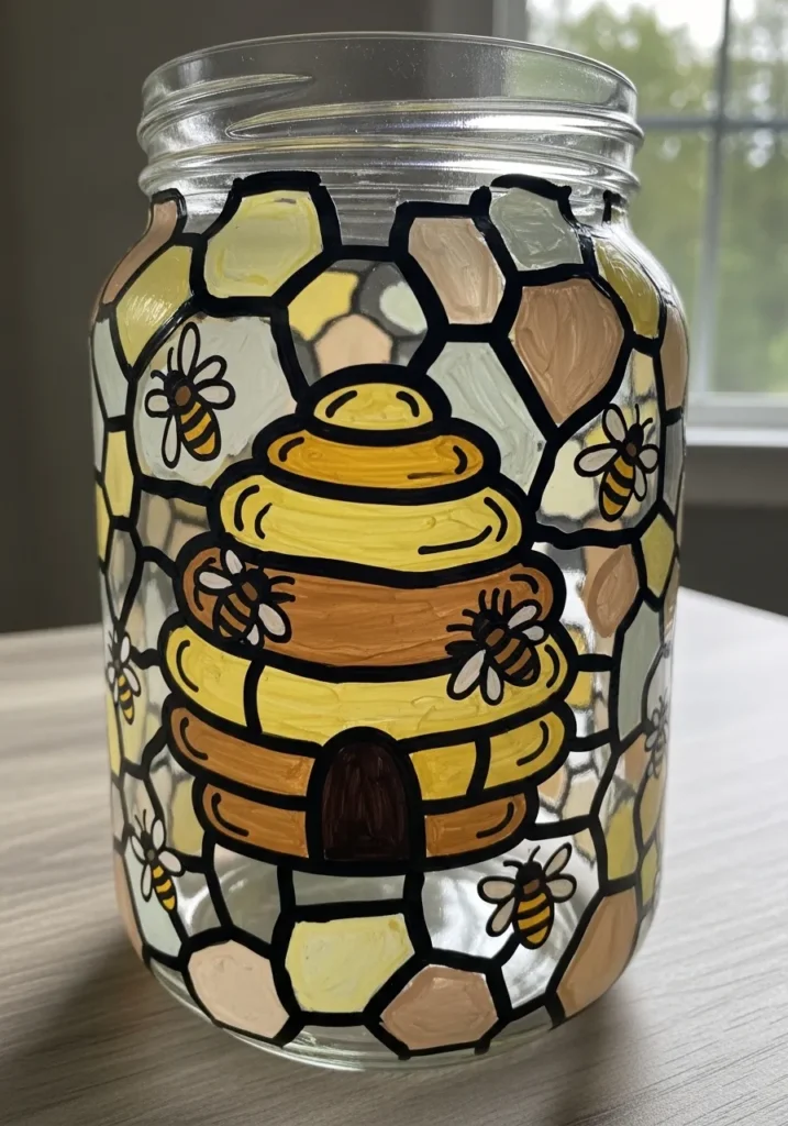 This charming mason jar has been transformed into a buzzing garden accent with a hand-painted beehive and honeycomb pattern. The central hive features warm layers of mustard yellow and amber brown, while the surrounding clear glass is filled with a mosaic of hexagonal shapes in soft cream and pale gold. Several tiny, detailed bumblebees are scattered across the design, complete with delicate white wings and classic black stripes. Bold black leading ties everything together, giving the jar a textured, three-dimensional feel that looks wonderful when used as a candle holder or a flower vase.