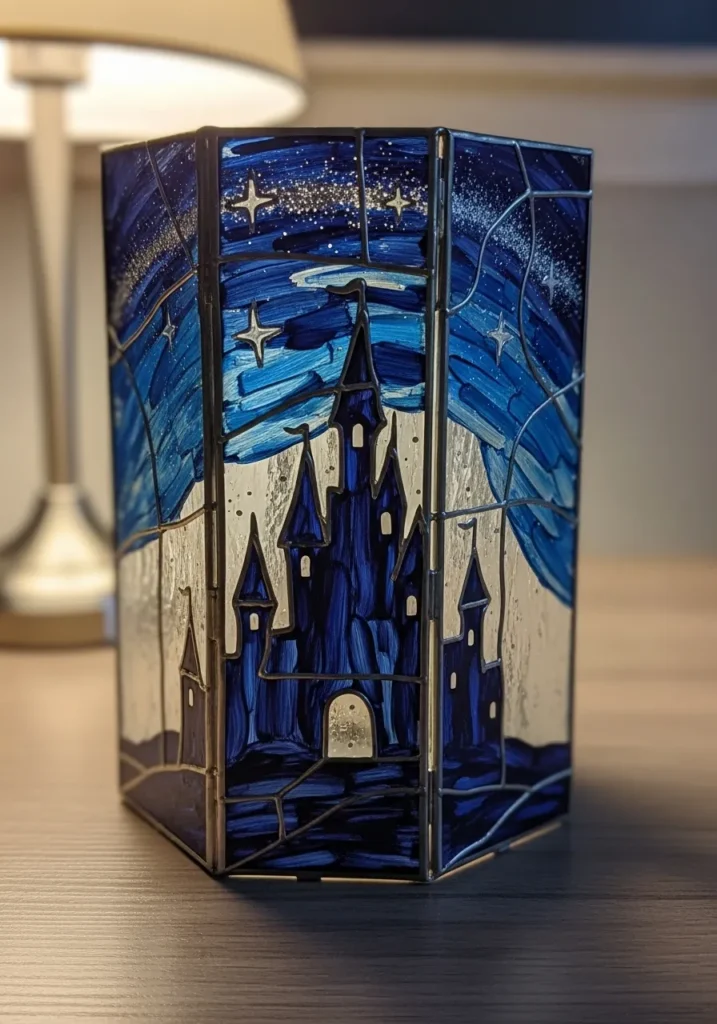 This stunning lantern includes a silhouette of a fairytale castle painted onto glass panels in shades of sapphire and navy. The sky is a swirl of cobalt blue and sparkling silver stars, giving the whole piece a magical and dreamy atmosphere. Thin lead lines separate the various blue tones, and the textured brushwork adds a sense of movement to the starry night.