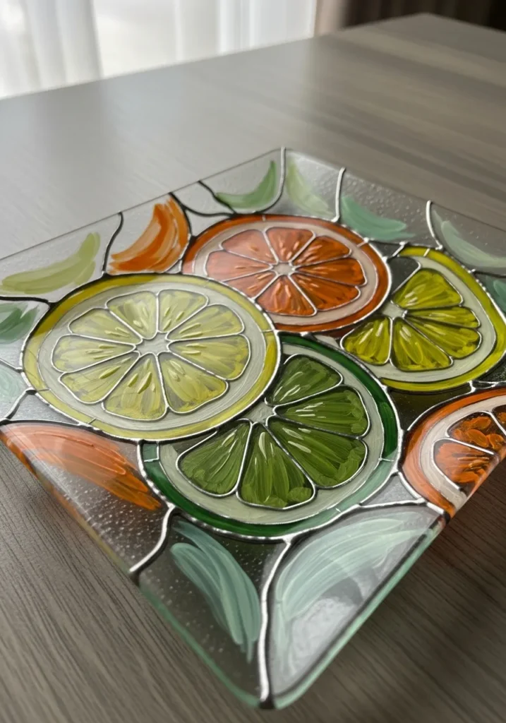 This square glass dish shows a vibrant array of hand-painted citrus slices in shades of lemon yellow, lime green, and juicy orange. The design uses raised silver to separate the colorful segments, creating a wonderful textured effect that mimics professional stained glass. Small painted leaf accents around the edges pull the whole fruity theme together. Each slice has visible brushstrokes within the acrylic paint, giving the piece a handmade and artistic feel that looks great on any entryway table.