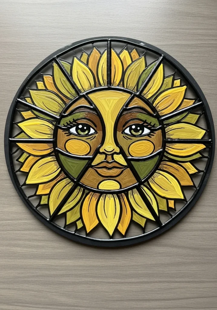 This circular art piece combines a classic sunflower motif with a serene celestial face at the center. The petals are filled with vibrant shades of lemon yellow, mustard, and earthy ochre, while the face features soft olive and tan accents that add a touch of personality. A thick black frame creates a bold stained glass effect, with individual segments that make the warm colors pop against the dark outlines.