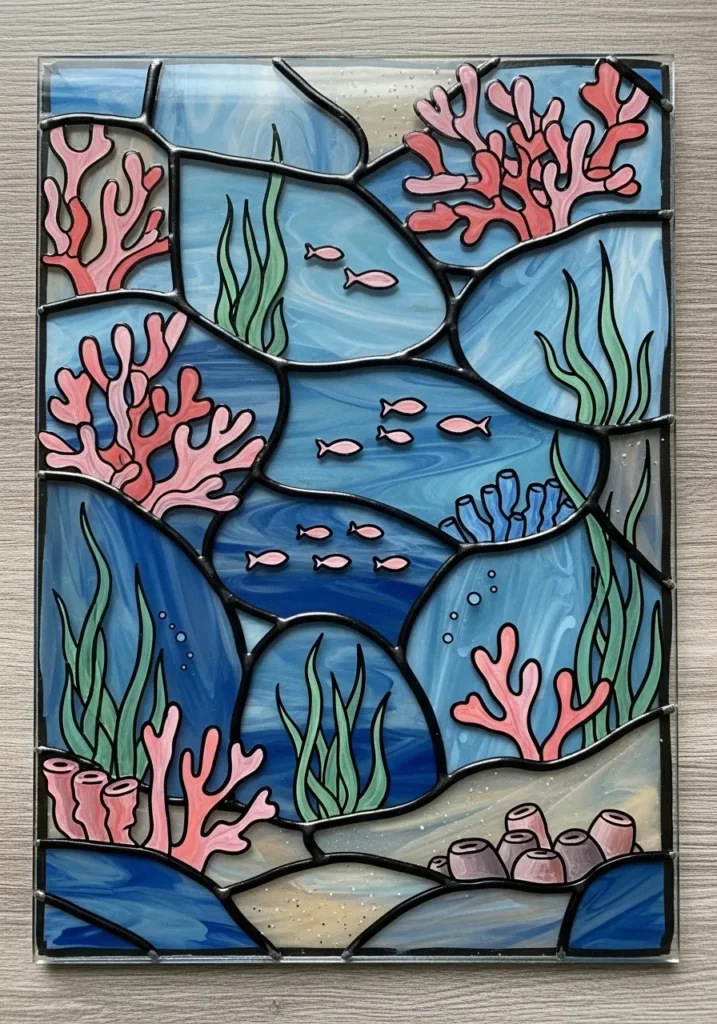 This stunning rectangular panel captures a serene underwater scene using a mix of deep blues and swirling turquoise shades for the ocean water. The design is packed with detail, including pink coral branches, green seagrass, and tiny schools of fish swimming through the different sections. Thick black leading separates the various water depths and sea life, giving it a professional mosaic look that is incredibly eye-catching. The smooth glass surface, combined with the opaque paint, creates a beautiful depth that makes the whole reef feel like it is coming to life.