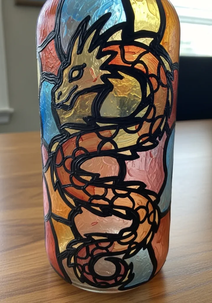 This project transforms a simple glass bottle into a mythical masterpiece using a vibrant palette of sunset oranges, fiery reds, and golden yellows. The central figure is a majestic dragon winding around the glass, defined by raised black outlines that mimic the texture of traditional leaded windows. Touches of sky blue in the background add a cooling contrast to the warm tones of the dragon scales, creating a balanced and eye-catching design.