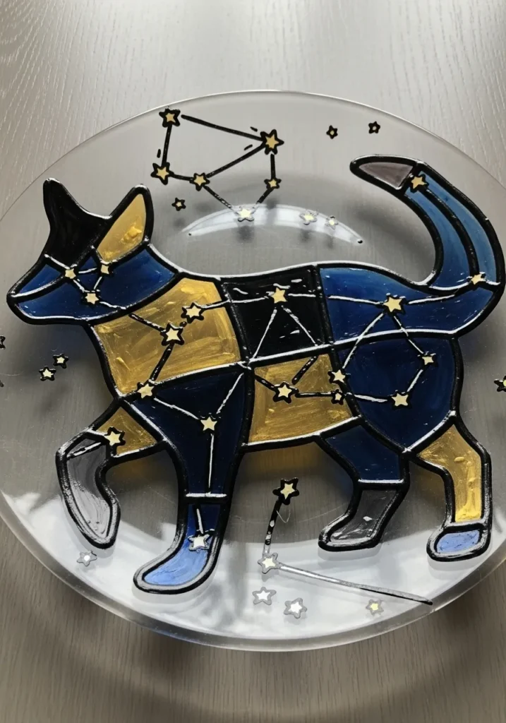 This unique glass plate features a stylized dog silhouette transformed into a shimmering night sky. The design uses a striking combination of deep navy blue and metallic gold paint, sectioned off by thick black, leading to a geometric, mosaic-like effect. Tiny white and gold stars are scattered across the dog’s body and the surrounding clear glass, with delicate, thin lines connecting them to form constellations. The contrast between the rich pigments and the transparent glass gives this piece a magical, celestial feel that is truly one of a kind.