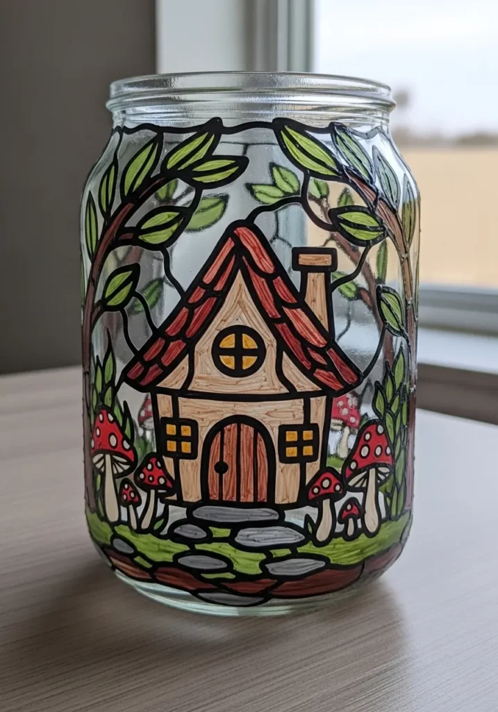 This adorable glass jar shows a tiny woodland scene complete with a cozy cottage and bright red toadstools. The design uses earthy cream and tan for the house walls with a vibrant terracotta roof, surrounded by leafy green branches and gray cobblestones. Each element is outlined in bold black paint to create a segmented glass look, while the transparent areas between the illustrations allow light to pass through the jar beautifully.