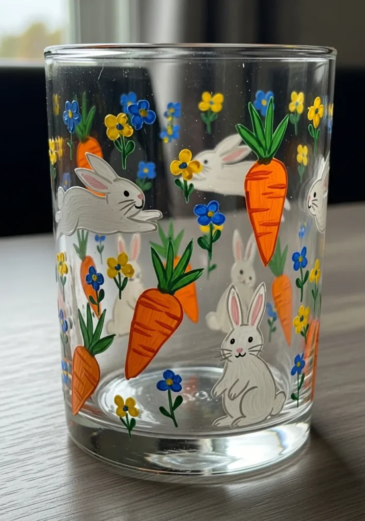 This adorable drinking glass features a lively spring scene filled with fluffy white bunnies leaping through a patch of oversized carrots and wildflowers. The carrots are painted in a rich pumpkin orange with deep ridges and bright emerald tops that stand out against the clear glass. Tiny blossoms in periwinkle blue and sunny yellow are scattered throughout the design, while the bunnies themselves are rendered in a thick white paint that gives their fur a soft, raised texture. It has a wonderful hand-drawn quality that feels like an illustration from a vintage children’s book brought to life.