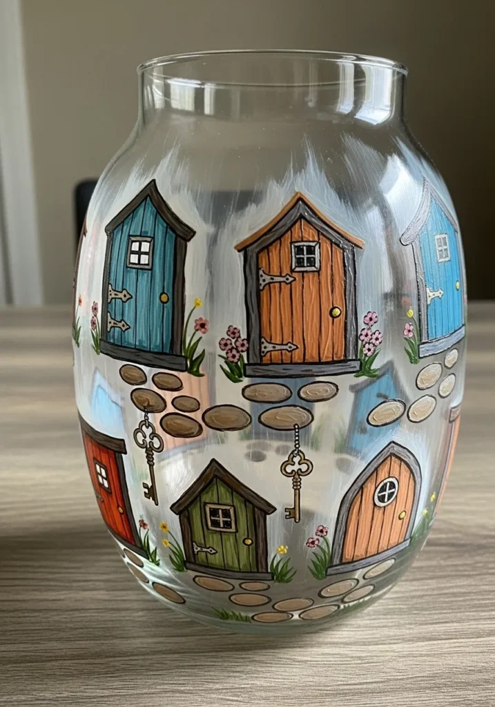 This enchanting glass jar features a whimsical neighborhood of tiny colorful sheds and secret garden doors painted in a delightful array of sky blue, burnt orange, and sage green. Each little structure is highly detailed with tiny window panes and antique-style hinges, while oversized golden keys hang from delicate painted chains between the buildings. A charming stone path circles the base of the jar with patches of pink and yellow wildflowers sprouting up to add a soft, natural touch. The background is finished with a wispy white frosted effect that gives the whole scene a dreamy, misty morning feel.