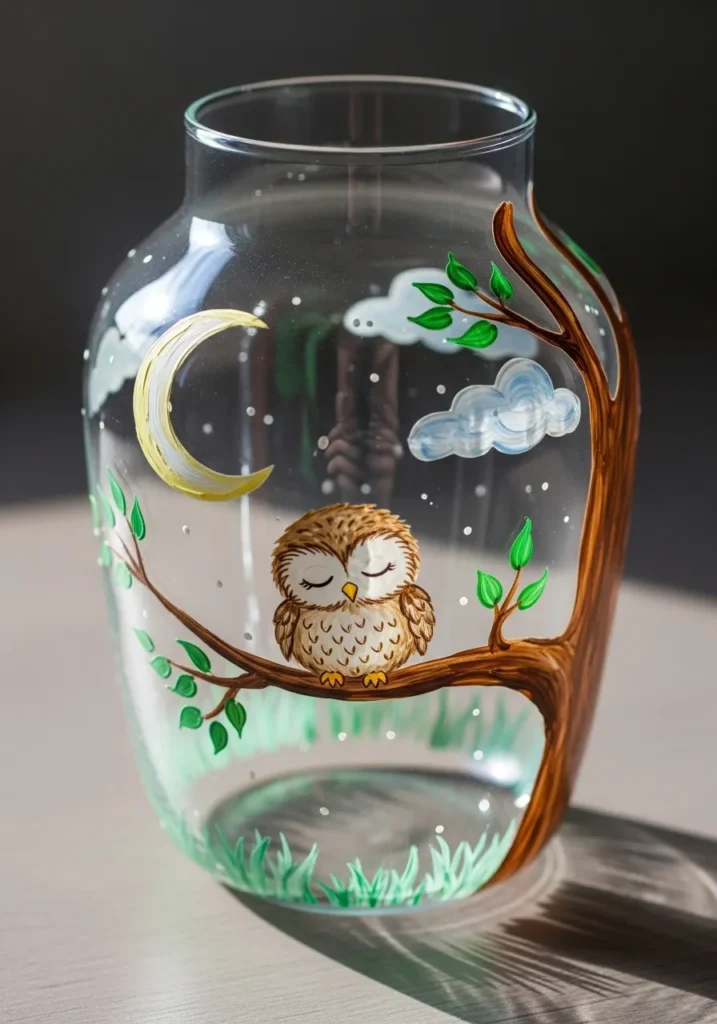 This beautiful glass vase features a serene nighttime scene with a precious, round owl resting peacefully on a sturdy tree branch. The owl is painted with lovely tan and cream feathers, showing off a soft texture that contrasts perfectly with the dark, chocolate-colored bark of the tree. A slender yellow crescent moon and wispy, light blue clouds float across the upper half of the glass, while a field of minty green grass lines the bottom. Tiny white dots are scattered throughout the clear spaces to represent a quiet starry sky, and the vibrant emerald leaves on the branches add a nice pop of color to the overall tranquil design.