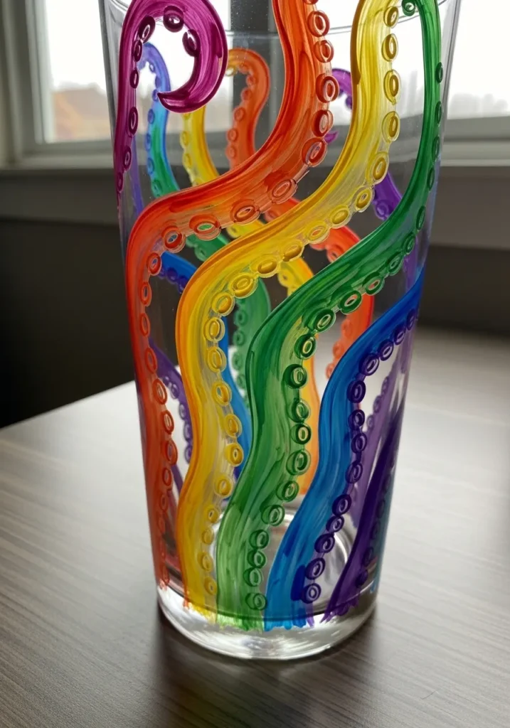 I am completely obsessed with this project because it is the ultimate way to master color blending without needing to draw complex shapes. If you are into bold and statement-making kitchenware, then this kraken-inspired glass is a total must-try for your next craft night. You can just let your brush flow in long, wavy lines and watch the colors melt into one another, which is honestly so therapeutic after a long week. It is a brilliant way to add a splash of nautical fantasy to your home, and I think a set of these would look absolutely incredible on an open bar cart.