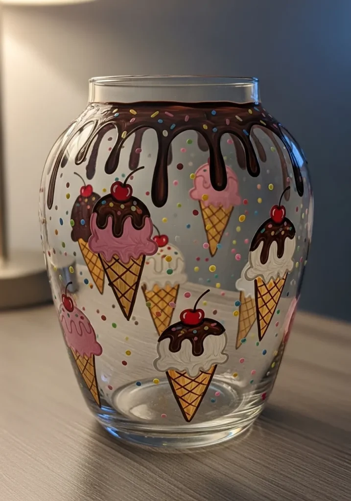 This round glass vessel is covered in a delicious pattern of hand-painted ice cream cones that look like they belong in a retro soda shop. Each waffle cone is filled with scoops of strawberry pink, chocolate brown, and vanilla white cream, topped off with a thick layer of fudge and a bright red cherry. A dramatic dark chocolate drip effect circles the entire rim of the vase, complete with a dusting of multicolored rainbow sprinkles that seem to be falling through the air. The paint has a rich, creamy texture that makes the treats look wonderfully indulgent against the clear glass.