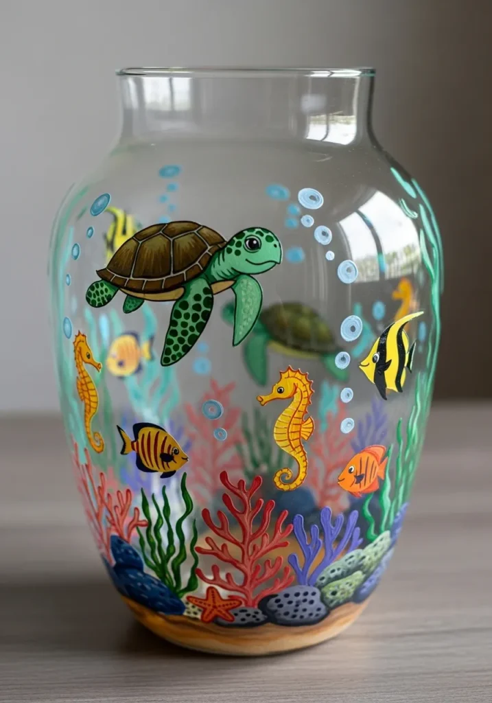 This curved glass vase features a stunning coral reef scene bursting with aquatic life. Brightly colored sea turtles with intricately patterned shells glide through a sea of vibrant red and purple coral branches, while cheerful yellow seahorses and striped tropical fish swim among the flowing green kelp. Tiny blue bubbles float toward the rim, and a sandy base with a little starfish ties the whole coastal look together. The paint has a smooth, opaque finish that makes every little scale and fin pop against the clear background.