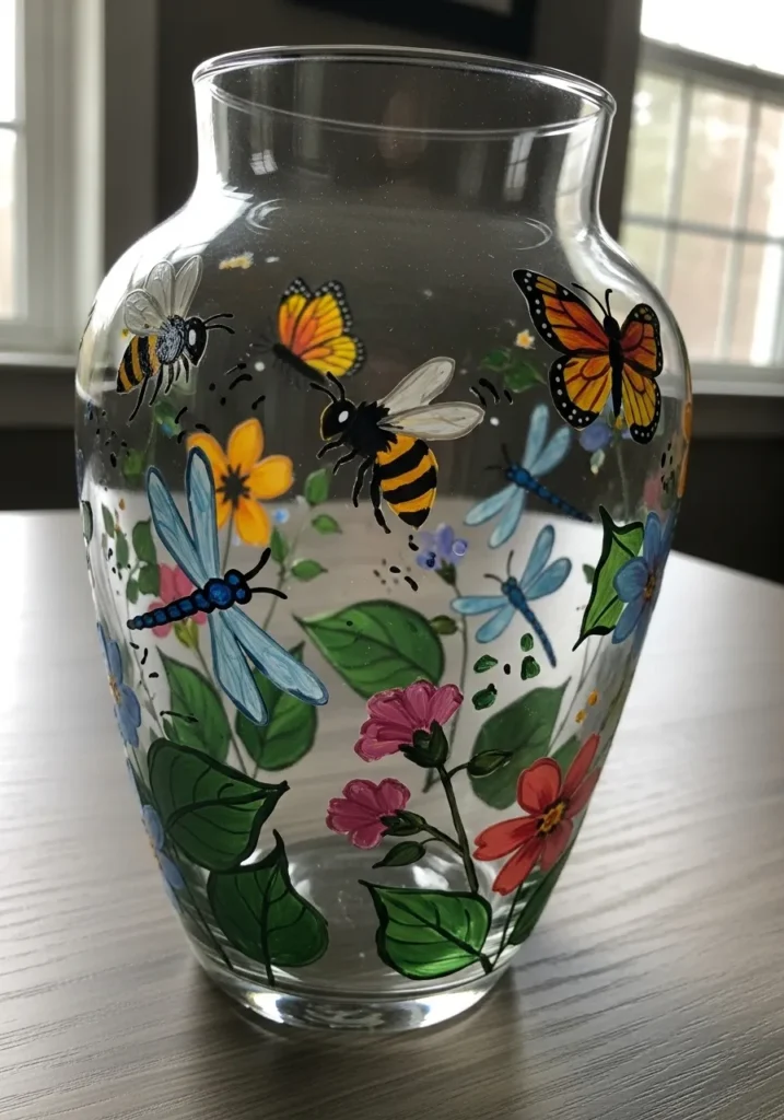 This beautiful glass vase is alive with the hum of a hand-painted summer meadow. Plump honeybees with fuzzy yellow and black stripes fly among graceful blue dragonflies and vibrant monarch butterflies with delicate black veined wings. Below them, a lush garden of pink, orange, and blue wildflowers sprouts from deep forest green leaves. The paint has a wonderful translucent quality in the wings that makes them look light and airy, while the solid floral colors anchor the design with a rich, earthy texture.