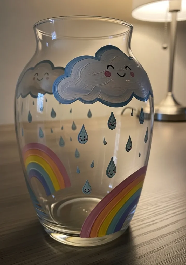 This darling glass vase captures a cheerful stormy day with fluffy white clouds and a pair of vibrant rainbows arching across the bottom. The clouds are painted with thick textured swirls of white and sky blue, giving them a 3D puffy look, while the tiny blue raindrops each sport a sweet smiling face. The rainbows feature a classic mix of candy pink, sunny yellow, and cool mint green that adds a pop of modern color to the clear glass surface. It has a glossy, smooth finish that makes the whimsical characters look like they are floating in midair.