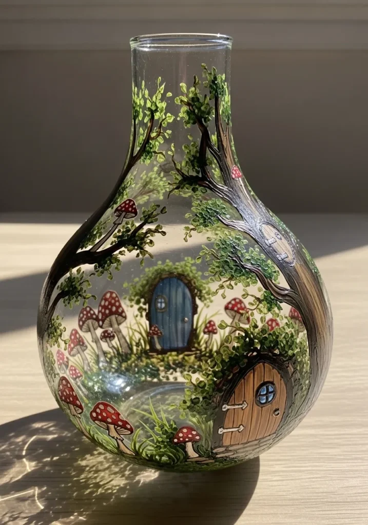 This round glass carafe features a hidden world nestled among the greenery with tiny wooden doors tucked into the bases of sprawling trees. The design is filled with adorable red toadstools with white polka dots scattered across a lush floor of hand-dotted moss and grass. Textured brown paint gives the tree trunks a realistic ridged feel, while a tiny blue door with a round window acts as a focal point in the distance. The use of varied green shades and delicate brushwork creates a sense of depth that makes it look like you are peeking into a secret forest clearing.