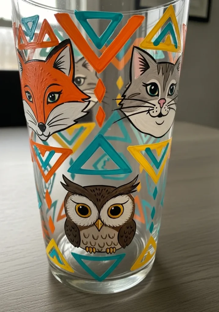 This tall glass tumbler features a playful mix of woodland animals and bold geometric patterns in a bright mid-century modern style. A clever orange fox, a sweet grey tabby cat, and a wide-eyed brown owl are painted with thick opaque colors and crisp black outlines that really pop. They are surrounded by a sea of triangles in turquoise, sunny yellow, and tangerine orange that overlap to create a sense of energy and movement. The paint has a wonderful glossy texture that makes the illustrations look like high-end professional decals rather than hand-painted art.