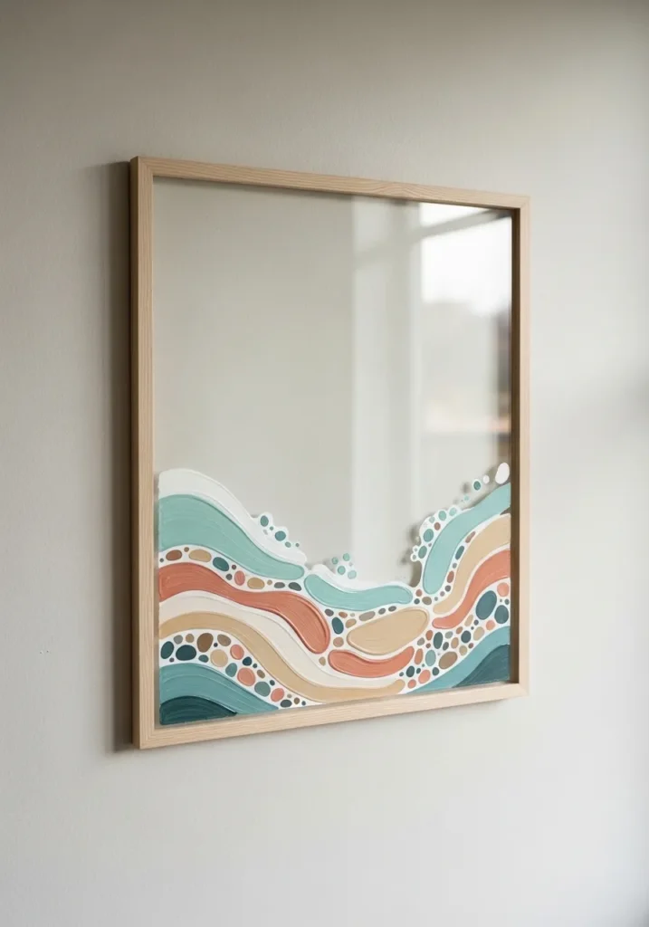 This minimalist glass painting showcases a series of sweeping organic curves and playful dots along the bottom of a wooden frame. The color palette is a sophisticated mix of muted teal, terracotta, sandy beige, and crisp white. Thick layers of paint give the waves a lovely 3D texture that stands out against the empty, clear glass above. It looks like a modern take on a coastal landscape with a clean and airy feel.