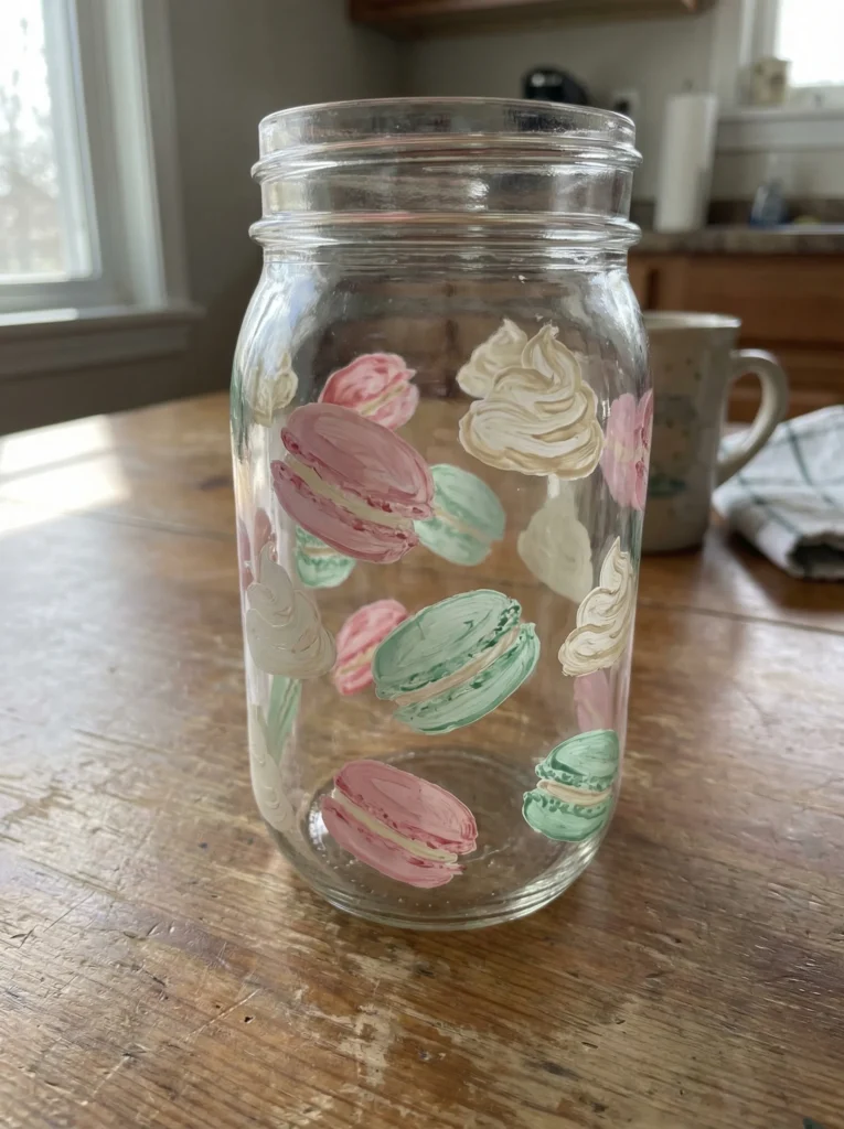 This delightful glass jar features a whimsical pattern of hand-painted macarons and fluffy cream swirls floating around its surface. The color palette includes soft rose pink, mint green, and creamy ivory with darker accents to define the ruffled edges of the cookies. Thick paint applications give the treats a wonderful 3D quality that makes them pop against the clear glass. Each little pastry is finished with a thin line of cream filling in the center for a realistic and tempting look.