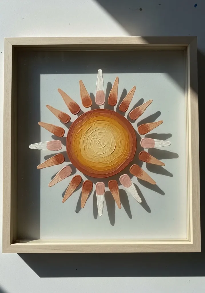 This stunning piece highlights a central sunburst design painted in thick, impasto layers on a glass surface within a light wooden frame. The sun itself is a swirling gradient of golden yellow and ochre, surrounded by a ring of petal-like rays in a warm palette of terracotta, dusty rose, and cream. Each stroke has a heavy, raised texture that catches the light beautifully, creating a 3D effect that feels modern and artisanal. The clean white background keeps the focus entirely on the rich, earthy tones and the tactile quality of the paint.