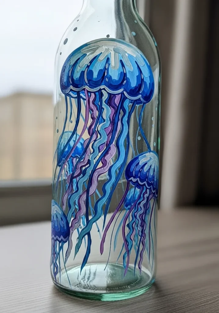 It’s amazing how these wavy lines make it almost impossible to mess up this project. Since jellyfish are naturally flowy and unique, you can just let your brush dance across the glass without stressing over perfect precision. It is a fantastic way to upcycle a plain water or soda bottle into a stunning piece of coastal decor that looks especially magical when the light hits those blue tones.