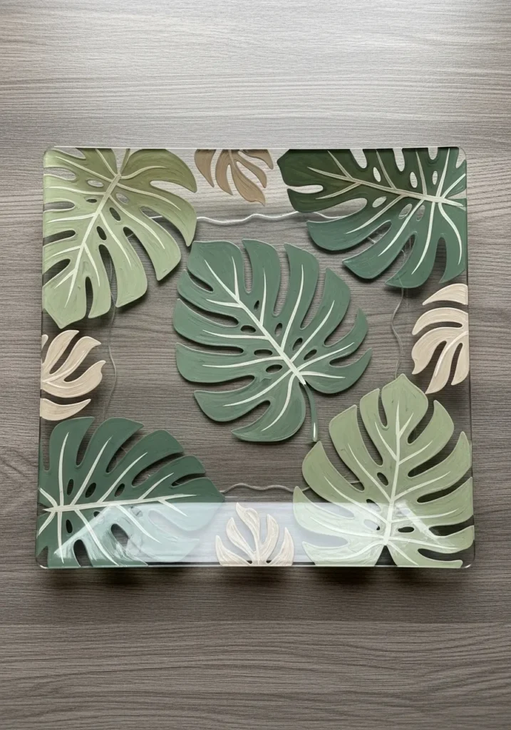 This square glass tray has a lush collection of monstera leaves in various shades of sage, forest green, and creamy beige. The leaves are painted with thick, visible strokes that give them a wonderful organic texture against the smooth, transparent surface. Thin white lines define the veins of each leaf, while delicate wavy outlines tie the whole botanical pattern together. It is a fresh and modern take on tropical decor that feels both sophisticated and earthy.