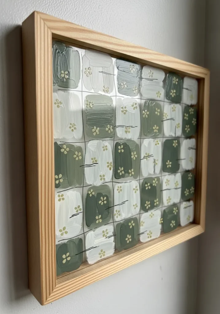 This framed piece features a contemporary grid pattern painted directly onto the glass in a calming palette of sage, mint, and cream. Each square is created with thick, expressive brushstrokes that give the artwork a lovely raised texture and a handmade feel. Tiny pale yellow flowers are dotted across the colored blocks, while thin black lines provide a delicate structural element that ties the whole geometric design together. The natural wood frame complements the earthy tones perfectly, making it a subtle yet stylish addition to any gallery wall.