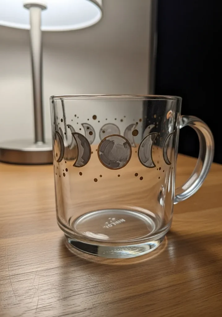 This clear glass mug includes a hand-painted lunar cycle wrapping around its center in a sophisticated celestial theme. The moon phases are rendered in textured silver and soft grey tones, with each crescent and full moon outlined in a shimmering gold. Small golden dots are scattered above and below the moons to represent a starry night sky. The thick metallic paint adds a lovely tactile feel to the smooth glass, making the morning tea or coffee ritual feel a bit more magical.