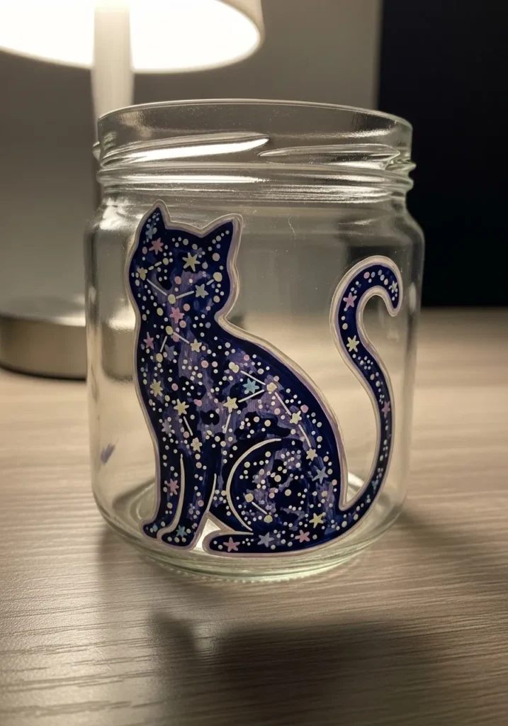 This clear glass jar gets a stellar makeover with a deep purple and blue starry cat silhouette. The rich, spacey colors are painted onto the smooth glass, creating a dreamy backdrop for tiny stars and celestial patterns in white and soft pinks. A light silvery outline makes the feline shape stand out clearly. I love how this combines a cool night sky effect with the cutest animal cutout style.
