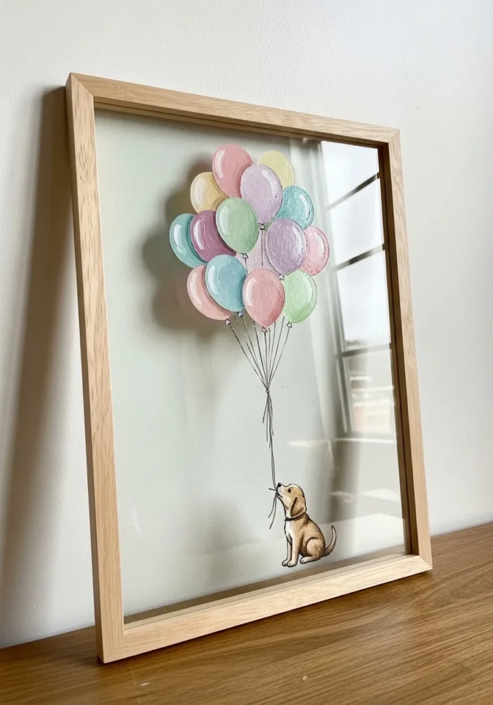 This adorable piece shows a tiny golden puppy gazing up at a large bunch of colorful balloons, all painted on the glass of a light wood frame. The balloons come in a soft palette of mint, lavender, baby blue, and blush pink, each with a little white highlight to give them a glossy, rounded look. Thin black lines act as the strings tied to the puppy’s nose, creating a sweet and whimsical scene that floats against the clear background. The delicate detail on the puppy adds a touch of realism to this otherwise dreamy, illustrative design.