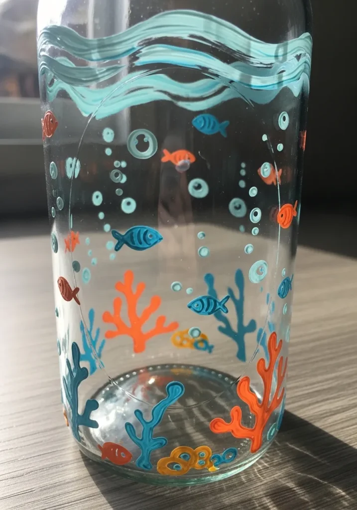 This project turns a plain glass bottle into a vibrant miniature aquarium with bright pops of orange and turquoise. Tiny fish swim among branching coral reefs while light blue bubbles float toward wavy lines representing the ocean surface. The paint has a slightly raised texture that makes the underwater scene feel tactile and lively against the clear background. Using a mix of bold primary colors creates a cheerful look that instantly brightens up a sunny windowsill.