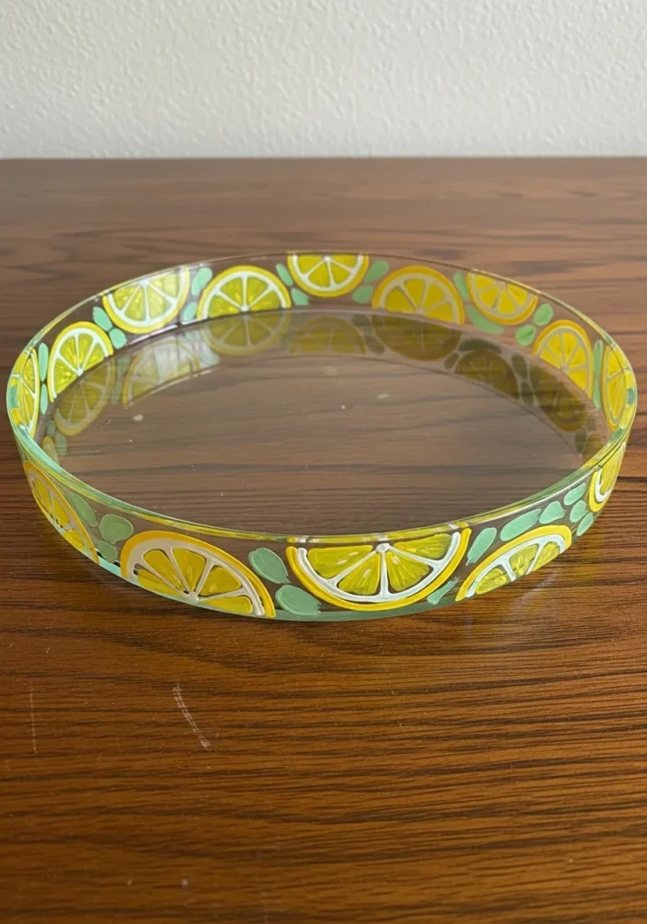 Bright citrus slices wrap around the outer rim of this clear glass dish to create a fresh and summery look. Each lemon half features bold yellow pulp sections accented with crisp white pith lines and a thick sunny rind. Tiny mint green leaves are tucked between the fruit slices to add a pop of contrasting color. The paint has a slightly raised and glossy texture that makes the lemons look juicy and ready for a garden party.