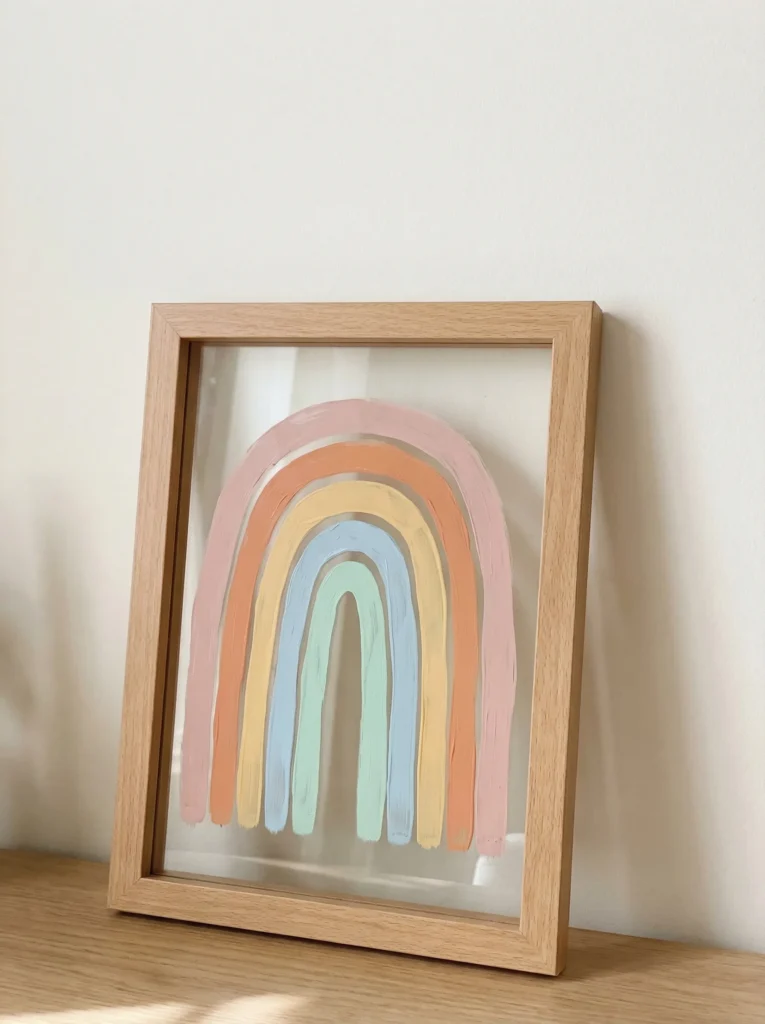 This charming piece shows a hand-painted rainbow in a soft and dreamy pastel palette centered on a clear glass pane. The design uses muted shades of dusty rose, terracotta, pale yellow, sky blue, and mint green to create a calming aesthetic. Visible brushstrokes add a wonderful, handmade texture to each arch, giving the artwork a rustic and authentic feel. Set within a light natural wood frame, the transparent background allows the rainbow to appear as if it is floating in mid-air.