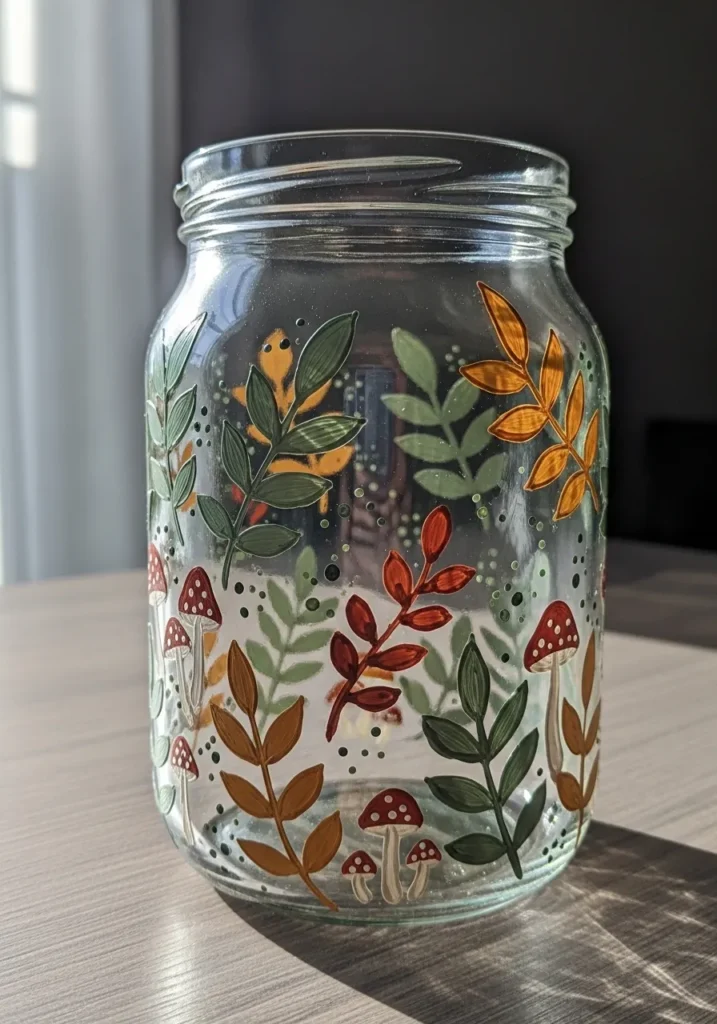 This charming glass jar features an earthy collection of hand-painted forest treasures, including spotted red mushrooms and stylized leafy branches. The color palette is wonderfully warm with deep rust oranges, forest greens, and creamy tan accents that make the botanical shapes pop against the clear glass. Each leaf shows off fine line details that give the design a polished, illustrative look, while tiny scattered dots fill the empty spaces like floating spores or forest mist.