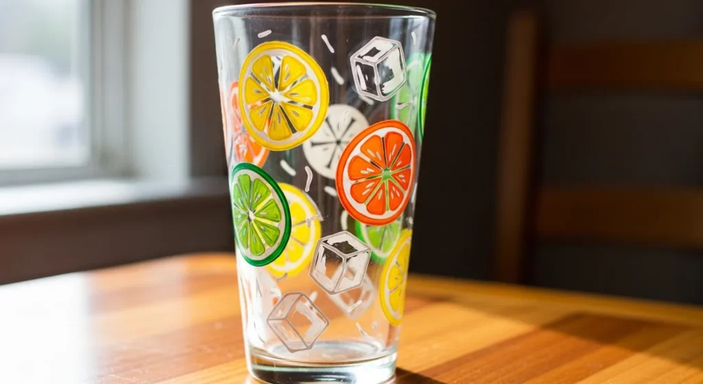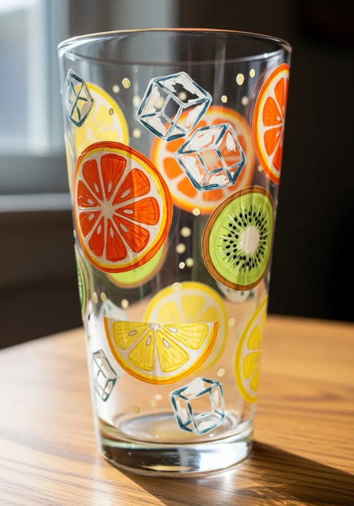 I am absolutely obsessed with this because it is the ultimate summer project for your patio glassware. If you are a fan of bright and bold kitchen decor, then these citrus slices are going to be your new favorite thing to paint. It is such a simple way to make a plain dollar store glass look like a designer piece from a fancy home store. Moreover, sipping an actual iced lemonade out of a glass painted with lemons just feels like peak main character energy.
