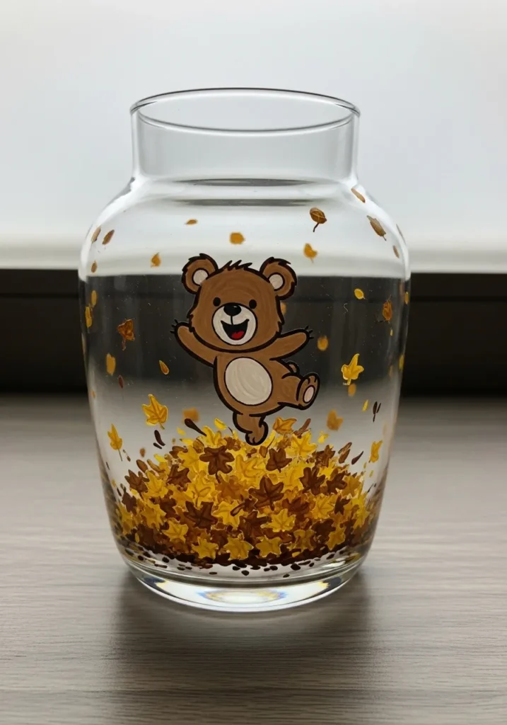 This adorable glass jar features a joyful hand-painted bear jumping into a giant pile of crunchy autumn leaves. The design uses a mix of warm cocoa browns for the bear and a vibrant explosion of mustard yellows and deep amber for the foliage. You can see the tiny individual leaf strokes at the bottom, which give the piece a wonderful sense of depth and texture. The clear glass background is scattered with drifting leaves that make it look like a crisp breeze just blew through the scene.