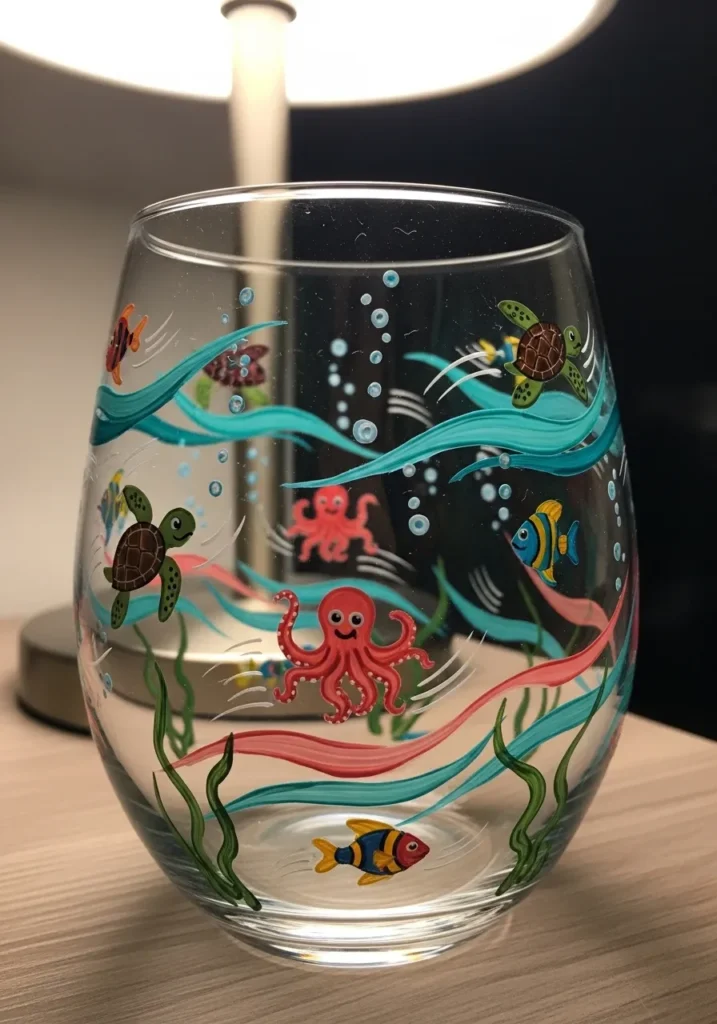 I am absolutely hooked on this design because it’s a masterclass in using layers to tell a story. By painting the seagrass at the very bottom and the bubbles near the rim, you create a 3D effect that makes it feel like you are looking through a real aquarium. It is such a playful and imaginative project that would make any dinner party feel like a seaside celebration. If you’re a fan of the “coastal grandmother” aesthetic or just love marine biology, this glass is the perfect way to bring a splash of the ocean to your tabletop.