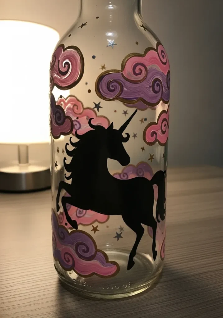 This magical glass bottle showcases a bold black unicorn silhouette prancing through a sky filled with swirling cotton candy clouds. The design features a gorgeous mix of plum, lavender, and rosy pink hues that have a thick and creamy texture outlined in shimmering gold paint. Tiny silver and gold stars are scattered throughout the clear spaces, while the matte finish of the clouds creates a stunning contrast against the smooth glass surface. It has such a whimsical and mystical vibe that it looks like a scene straight out of a storybook.