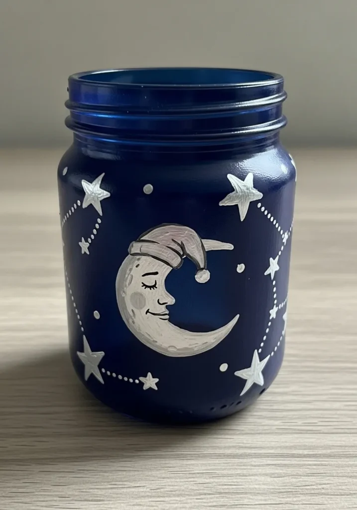 This dreamy navy blue jar features a peaceful hand-painted crescent moon wearing a cozy nightcap. Surrounding the sleepy moon are delicate white stars and dotted silver lines that form elegant constellations against the deep indigo background. The paint has a smooth, satiny texture that gives the glass a rich, opaque finish, while the fine white details add a crisp, professional touch to the celestial scene.