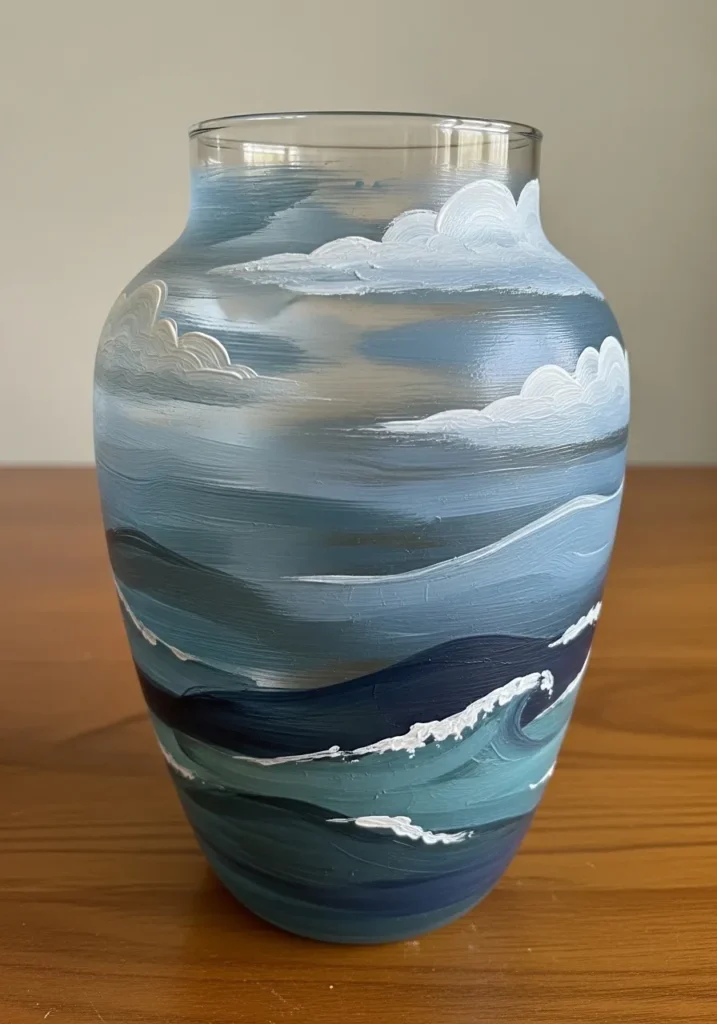 This stunning glass vase features a powerful and moody seascape painted with thick, expressive layers of acrylic or glass paint. The design transitions from deep indigo depths to frothy turquoise peaks with brilliant white foam capping the crest of each wave. Swirling grey and slate blue clouds fill the upper portion of the glass while the heavy impasto texture creates a 3D effect that makes the water look like it is actually churning. It is a bold and artistic piece that captures the wild energy of the sea through a cool and calming color palette.