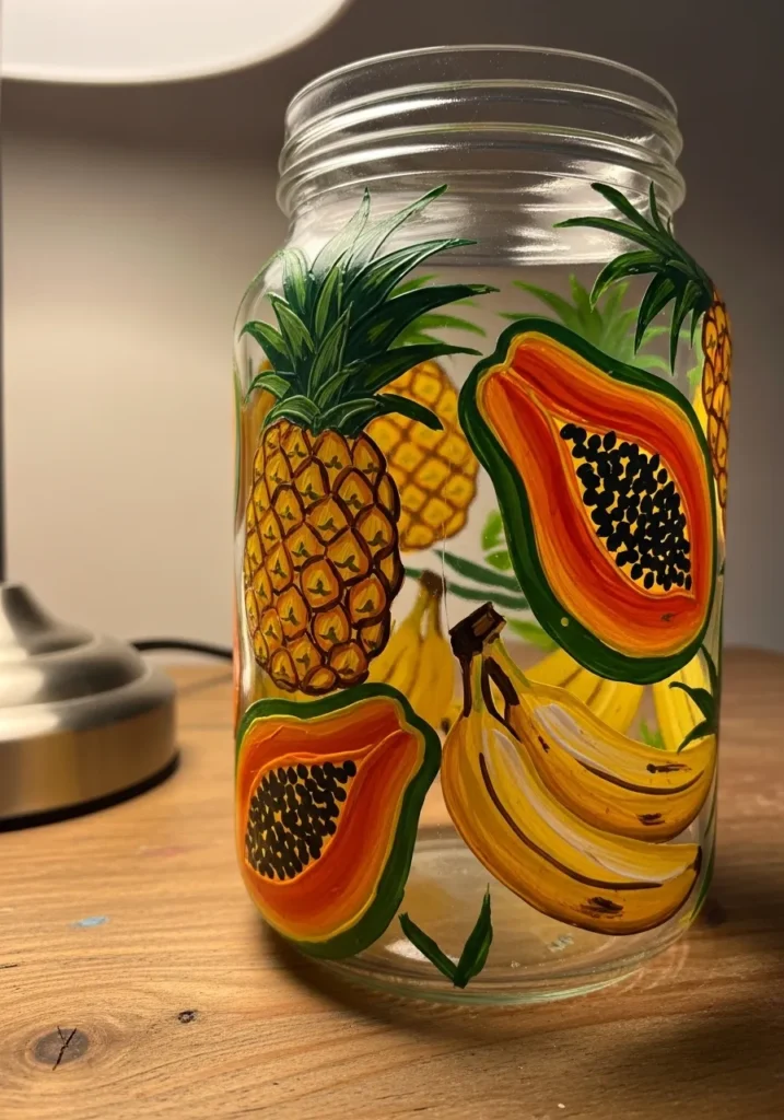 I am absolutely obsessed with this one because it brings such a cheerful, vacation vibe to a simple pantry staple. If you are a fan of bold colors and want to practice your shading, these tropical shapes are super forgiving and fun to experiment with. It is a fantastic way to brighten up a countertop or create a unique gift for a friend who loves all things tropical. You really can’t help but smile when you see these vibrant fruits glowing in the light of your kitchen window.
